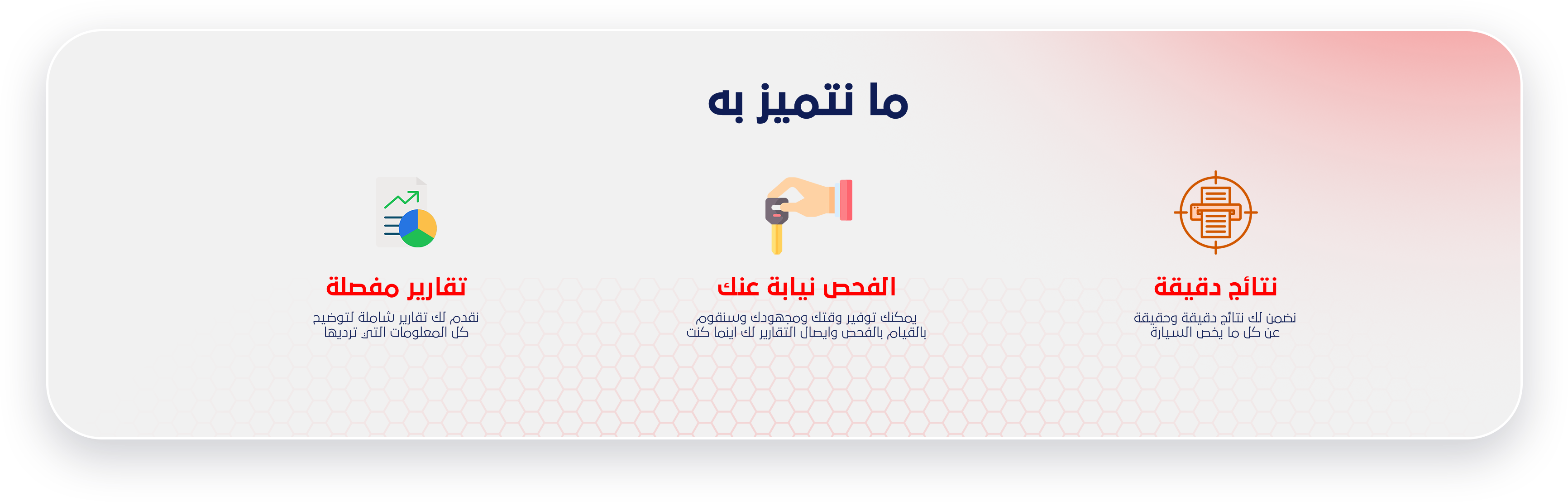 تغطي باقة الفحص الشامل تفاصيل دقيقة عن المحرك وهيكل السيارة، مما يساعد على تقييم حالة السيارة من الداخل والخارج بكفاءة عالية